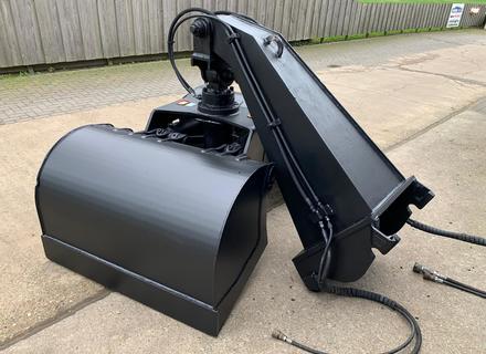 Eigen gewicht ±1200kg, inhoud ±1000ltr., breedte 132cm, spreidopening 225cm, ophanging CW40, hydr. rotatie, Opgebouwd met verlenggiek 170 cm, incl. slangen en koppelingen. Ook te huur!