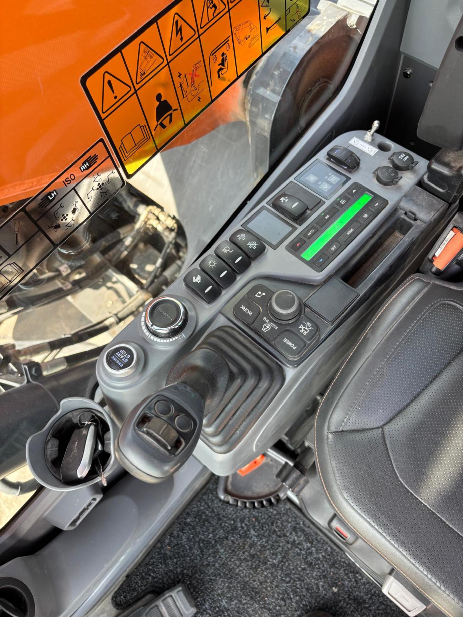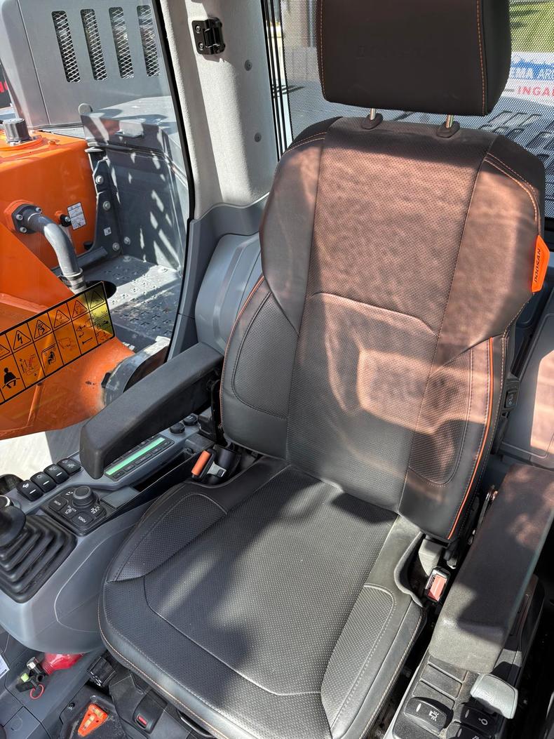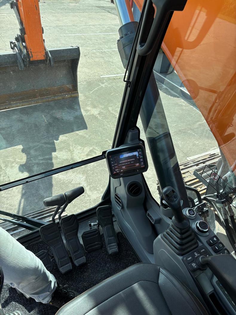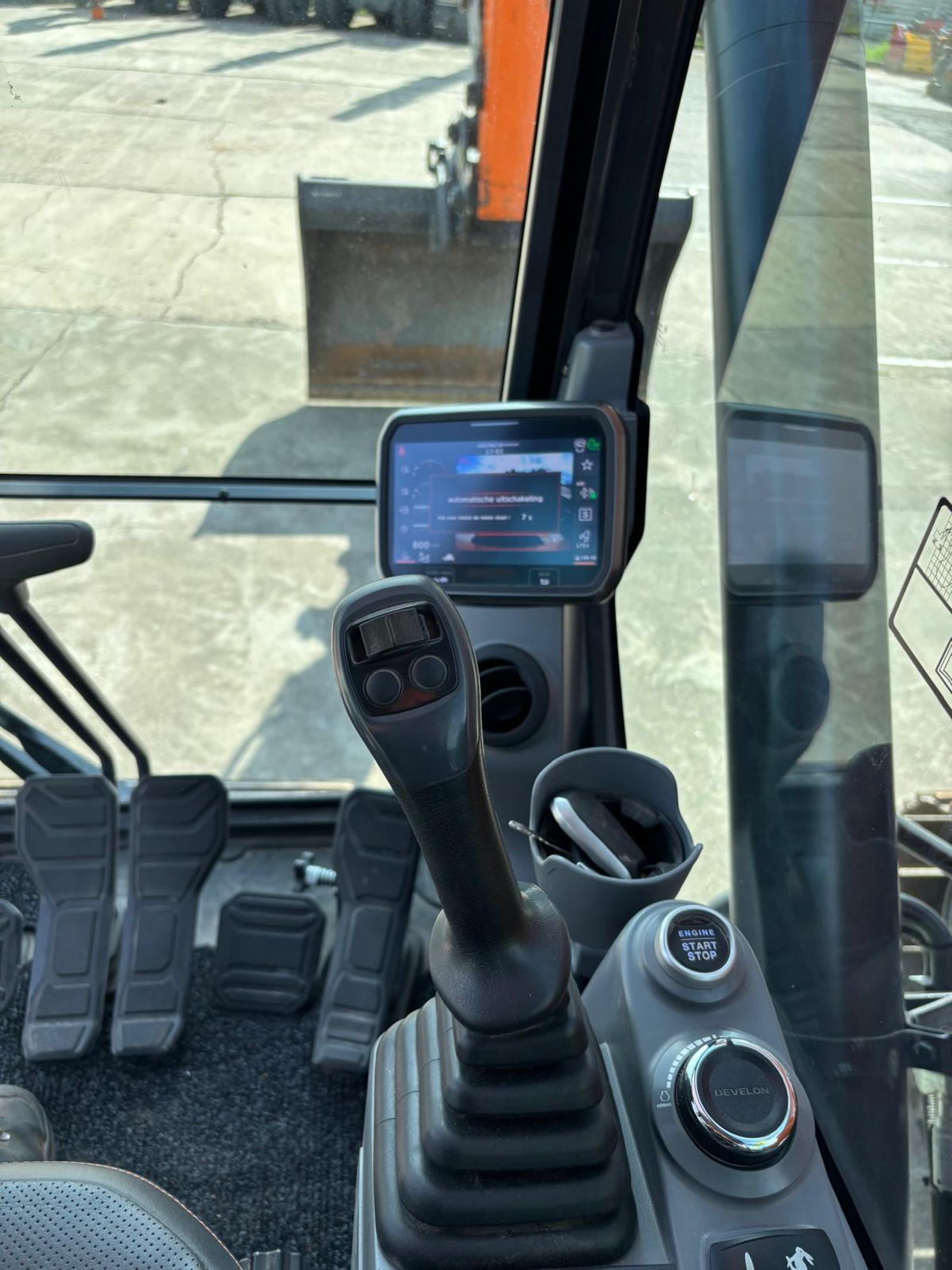 Develon Compact! Eigen gewicht ±24900kg, verstelgiek 585cm, steel 290cm, rupsplaten 90cm, breedte 329cm, zwenkradius ballast 168cm, hamer/rotatiefunctie, Develon DL06 6-cilinder dieselmotor 166Pk Stage V, ruime cabine met verstelbare stoel incl. verwarming én koeling, camera, extra werkverlichting, DFM. Opgebouwd met hydr. snelwissel CW40, brede graafbak 210cm-1500l., automatische vetsmering, cabineramen getint.