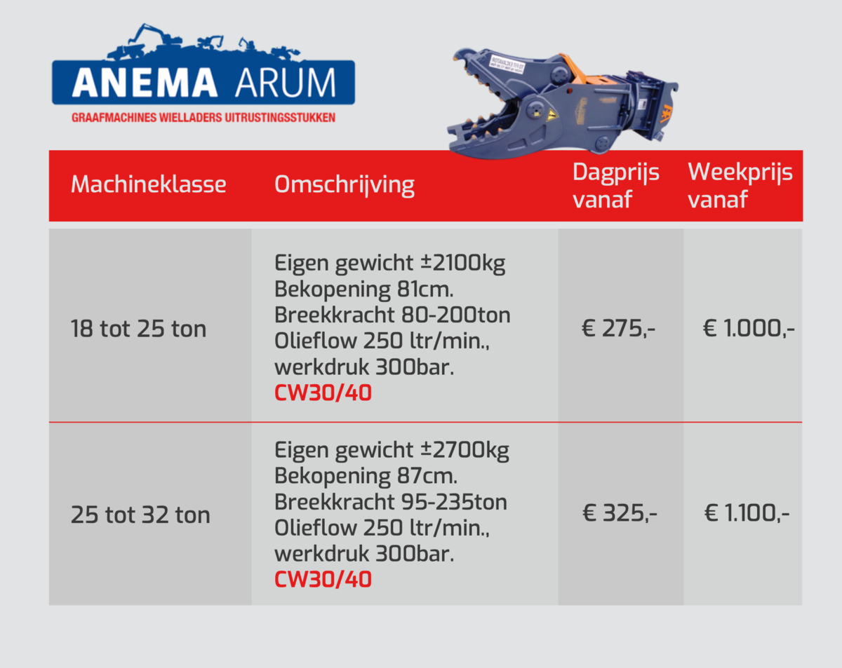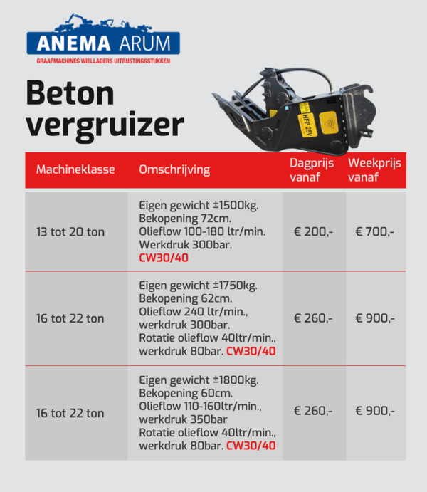 In de tabel hieronder en in de afbeeldingen kunt u de prijzen vinden voor vergruizers die wij in onze verhuur hebben. Door de PDF hieronder te downloaden kunt u de huurprijzen van al onze uitrustingsstukken bekijken. Klik hier voor onze algemene verhuurvoorwaarden. Neem voor meer informatie contact met ons op via 0517 - 641329 of mail naar verhuur@anemabv.nl.