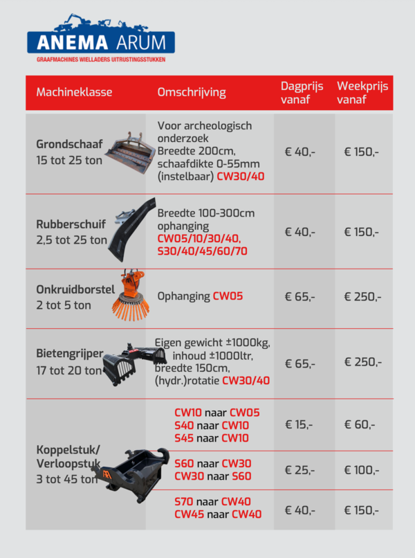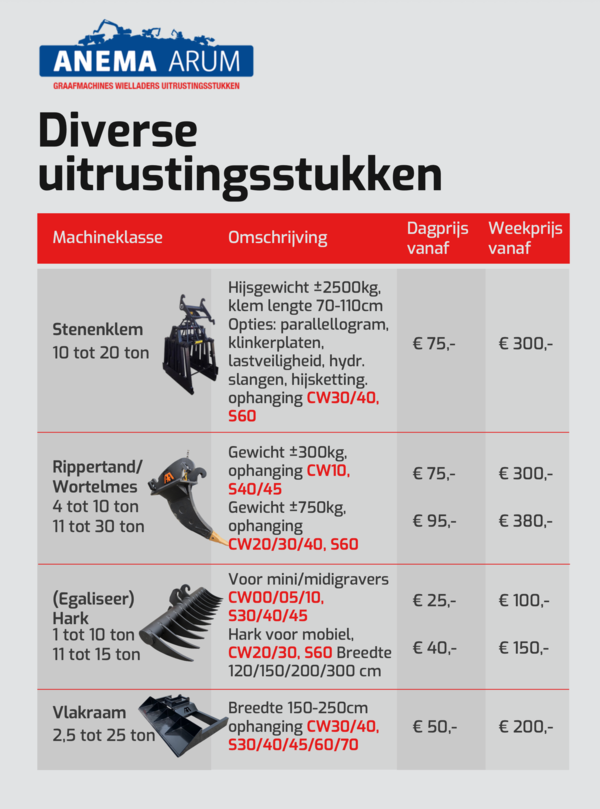 In de tabel hieronder en in de afbeeldingen kunt u de prijzen vinden voor diverse uitrustingsstukken die wij in onze verhuur hebben. Door de PDF hieronder te downloaden kunt u de huurprijzen van al onze uitrustingsstukken bekijken. Klik hier voor onze algemene verhuurvoorwaarden. Neem voor meer informatie contact met ons op via 0517 - 641329 of mail naar verhuur@anemabv.nl.