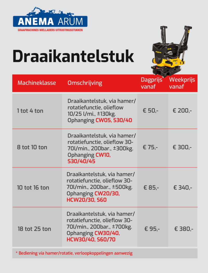 In de tabel hieronder en in de afbeeldingen kunt u de prijzen vinden voor draaikantelstukken die wij in onze verhuur hebben. Door de PDF hieronder te downloaden kunt u de huurprijzen van al onze uitrustingsstukken bekijken. Klik hier voor onze algemene verhuurvoorwaarden. Neem voor meer informatie contact met ons op via 0517 - 641329 of mail naar verhuur@anemabv.nl.