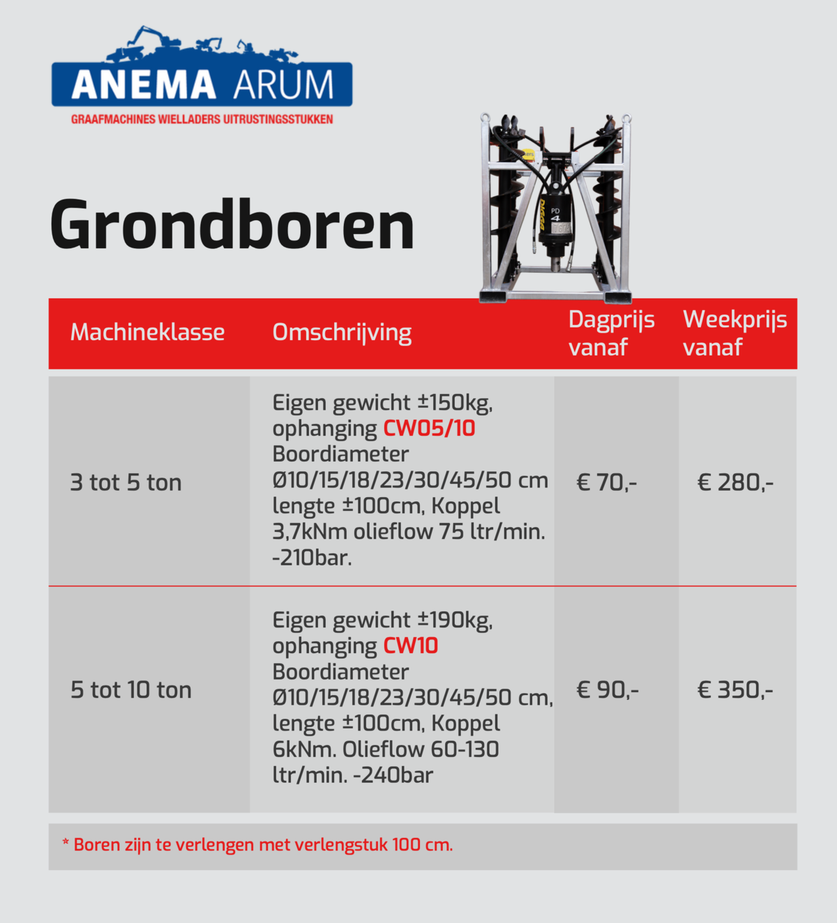 In de tabel hieronder en in de afbeeldingen kunt u de prijzen vinden voor grondboren die wij in onze verhuur hebben. Door de PDF hieronder te downloaden kunt u de huurprijzen van al onze uitrustingsstukken bekijken. Klik hier voor onze algemene verhuurvoorwaarden. Neem voor meer informatie contact met ons op via 0517 - 641329 of mail naar verhuur@anemabv.nl.