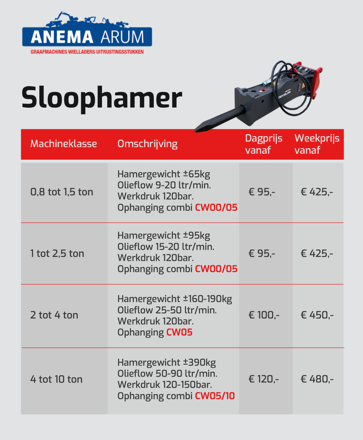 In de tabel hieronder en in de afbeeldingen kunt u de prijzen vinden voor sloophamers die wij in onze verhuur hebben. Door de PDF hieronder te downloaden kunt u de huurprijzen van al onze uitrustingsstukken bekijken. Klik hier voor onze algemene verhuurvoorwaarden. Neem voor meer informatie contact met ons op via 0517 - 641329 of mail naar verhuur@anemabv.nl.