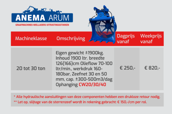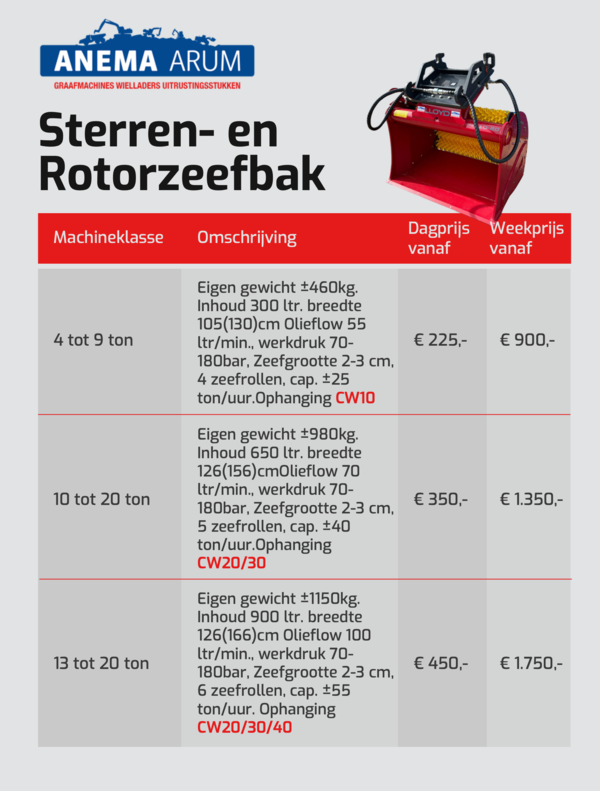 In de tabel hieronder en in de afbeeldingen kunt u de prijzen vinden voor sterren- en rotorzeefbakken die wij in onze verhuur hebben. Door de PDF hieronder te downloaden kunt u de huurprijzen van al onze uitrustingsstukken bekijken. Klik hier voor onze algemene verhuurvoorwaarden. Neem voor meer informatie contact met ons op via 0517 - 641329 of mail naar verhuur@anemabv.nl.