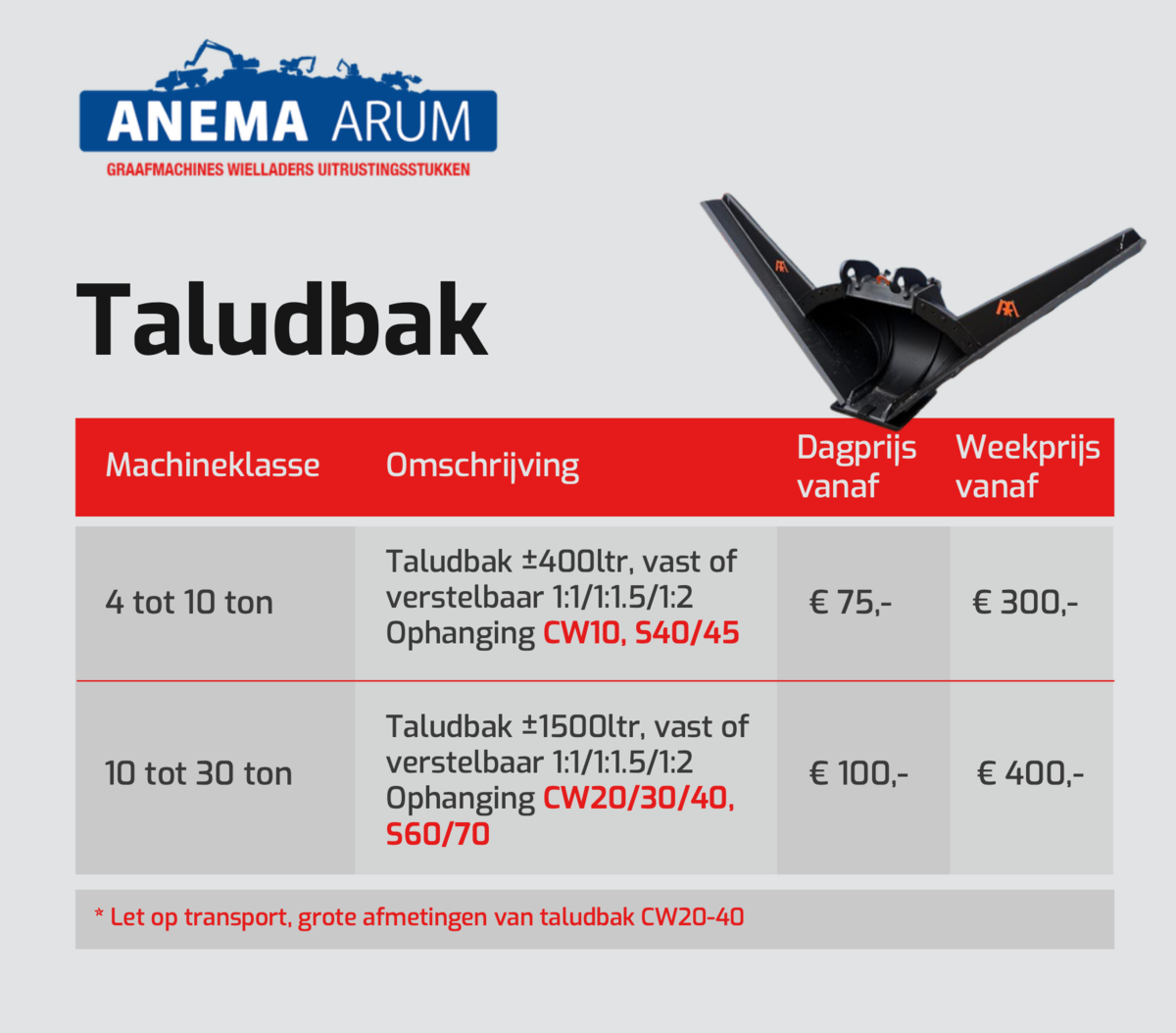 In de tabel hieronder en in de afbeeldingen kunt u de prijzen vinden voor taludbakken die wij in onze verhuur hebben. Door de PDF hieronder te downloaden kunt u de huurprijzen van al onze uitrustingsstukken bekijken. Klik hier voor onze algemene verhuurvoorwaarden. Neem voor meer informatie contact met ons op via 0517 - 641329 of mail naar verhuur@anemabv.nl.