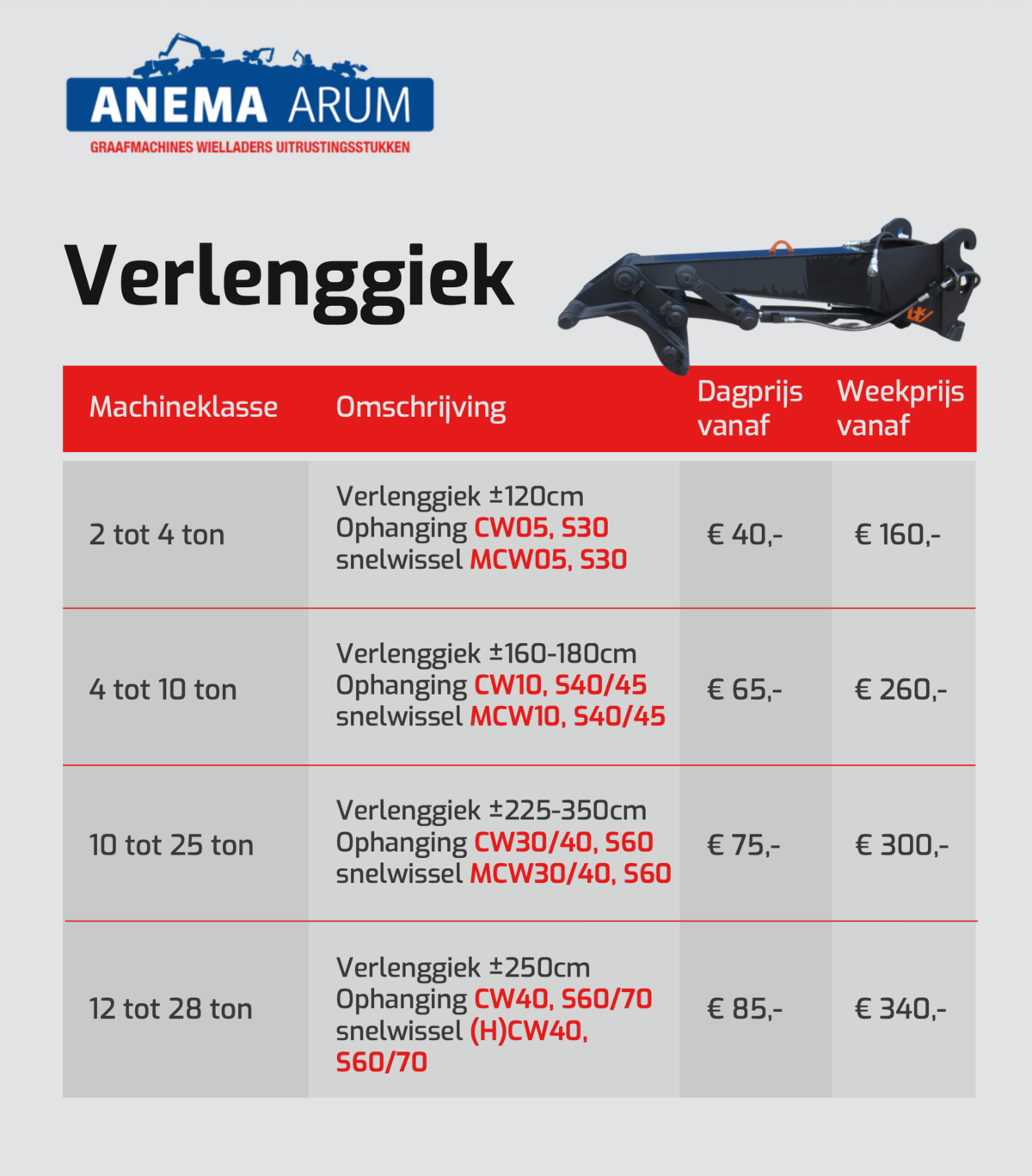 In de tabel hieronder en in de afbeeldingen kunt u de prijzen vinden voor verlenggieken die wij in onze verhuur hebben. Door de PDF hieronder te downloaden kunt u de huurprijzen van al onze uitrustingsstukken bekijken. Klik hier voor onze algemene verhuurvoorwaarden. Neem voor meer informatie contact met ons op via 0517 - 641329 of mail naar verhuur@anemabv.nl.