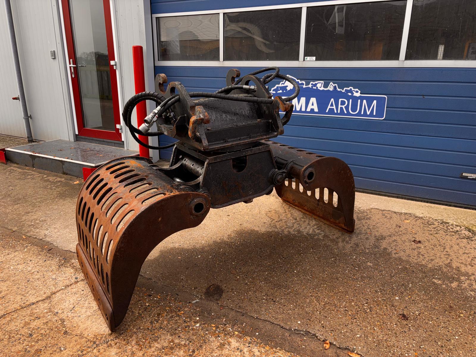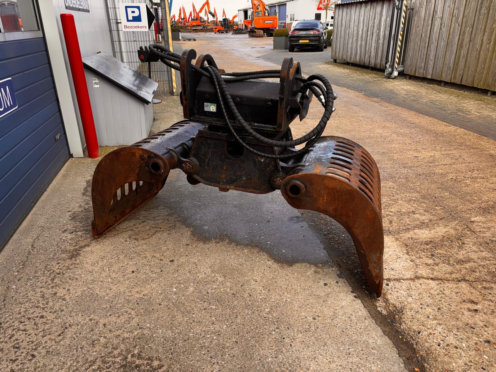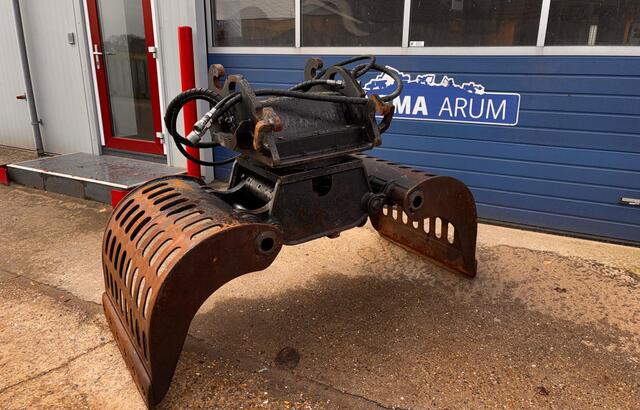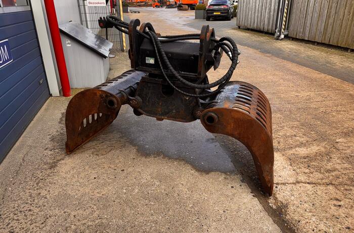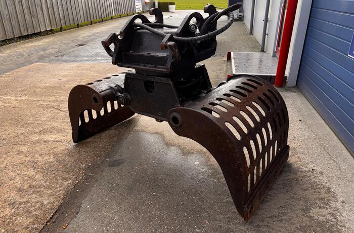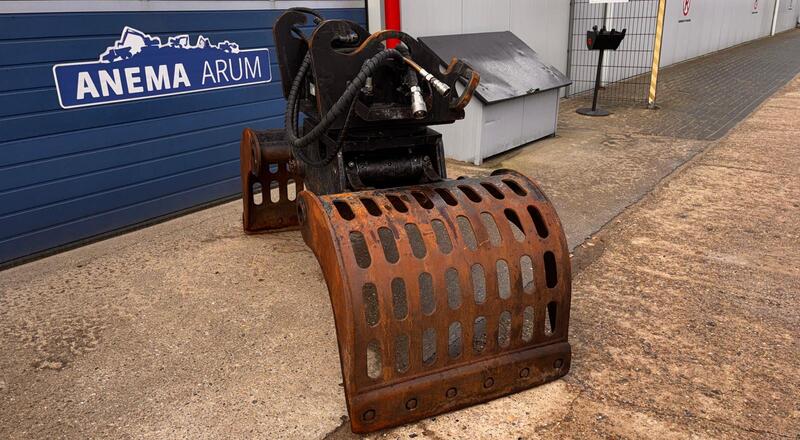 Eigen gewicht 950kg, machineklasse 13-20ton, ophanging CW3/4, hydr. rotatie, schaalbreedte 90cm, spreidopening 195cm, inhoud 600ltr. Incl. wisselmessen, slangen en koppelingen.