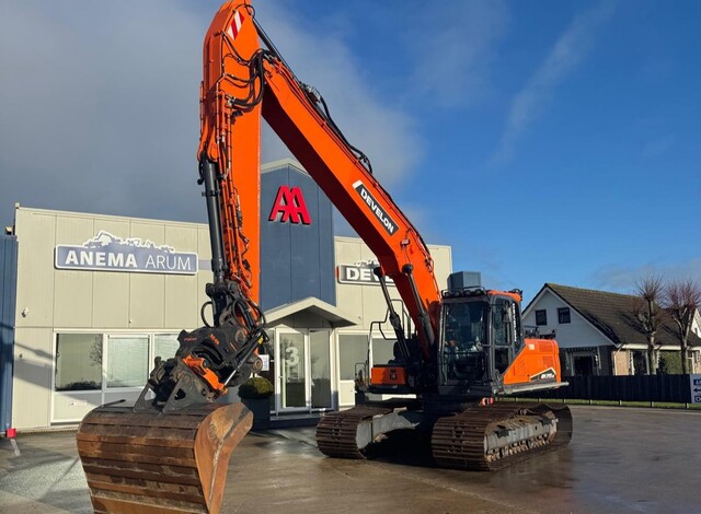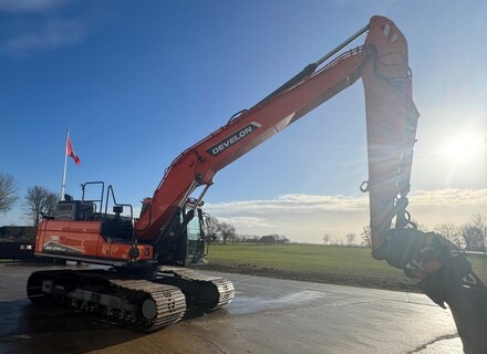 Multi-uitvoering met monogiek verlengd naar 670cm en steel verlengd naar 390cm, bereik ±1150cm, extra hefpunt(dom) onder giek, extra ballast ±2750kg, eigen totaal gewicht ±26000kg, hijshaak binnenkant lepelsteel, brede rupsplaten 90cm, extra LED-werkverlichting, Develon DL06 6-cil. commonrail dieselmotor Tier V, cabine met instelbare & luchtgeveerde stoel incl. verwarming en koeling, climate control, AVM 360° camerasysteem en ultrasonic sensoren ballast, DFM. Opgebouwd met draaikantelstuk engcon EC226 QS70/QS70 incl. QS70 snelwissel met DC2-systeem via 2-hydr.slangen systeem met engcon computer en joysticks, brede graafbak 190cm-1250ltr, Leica GPS voorbereiding, hamer/rotatiefunctie incl. koppelingen, cabine overdruk voorbereid incl. signalering CCU excl. overdrukunit, automatische centrale vetsmering Groeneveld, treeplank langs gehele zijde links & rechts incl. klompensteun, 6st rode LED-sierlampen op ultrasonic balk, 4st oranje toplamp onder LED-verlichting, LED-werklampen L en R ballast, 2st LED-werklamp op lepelsteel -links en rechts, 27MC-inbouw aangestuurd via joystick, 24V-aansluiting voor extern tanken bij brandstofvulsysteem, incl. kraanboek. Nette goedwerkende machine geheel gespoten in 2K-lak.