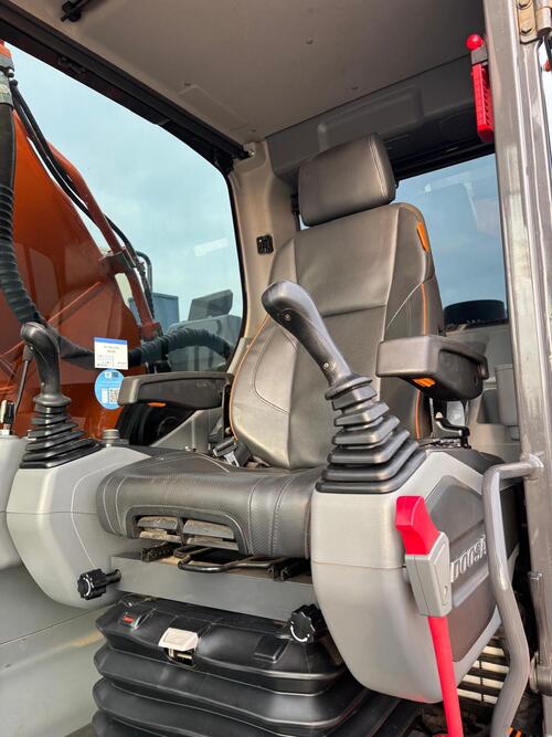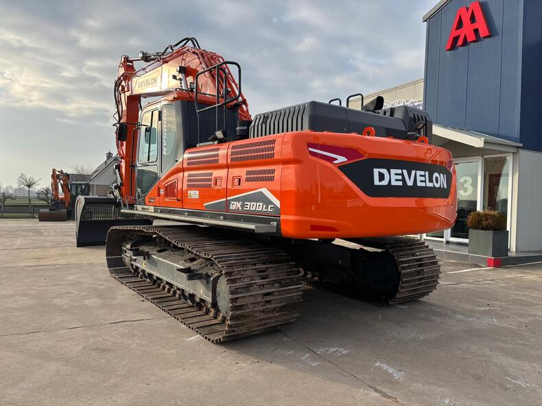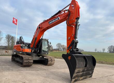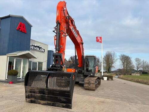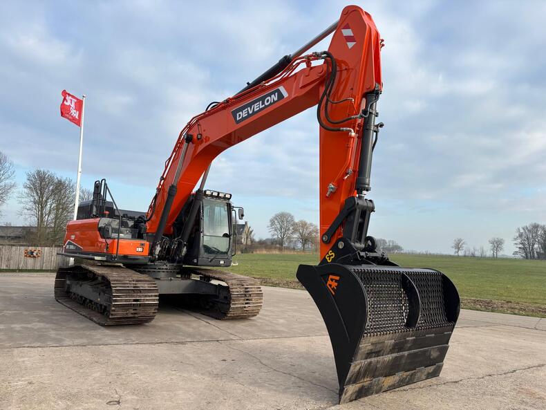 Eigen gewicht ±31000kg, Develon DL08 6-cilinder dieselmotor Stage V, monogiek 625cm, steel 310cm, brede rupsplaten 90cm, hamer/rotatiefunctie, LED-werklampen, radio met bluetooth, 8" display, AVM 360gr. camera, climate control, DFM. Opgebouwd met; hydr. snelwissel CW40, AA brede graafbak 220cm-2400ltr., treeplank langs gehele zijde L&R, getinte ramen. Vele opties mogelijk! Ook te huur!