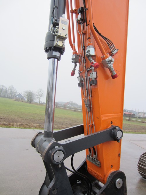 Opgebouwd met hydr. snelwissel CW40 en AA brede slotenbak 210-1450ltr., kettingkist op onderwagen, treeplank incl. klompensteun, voorbereiding kantelstuk, slangbreuk op bakcilinder, montageplaatjes voor 3D-GPS, hoogtebegrenzer.