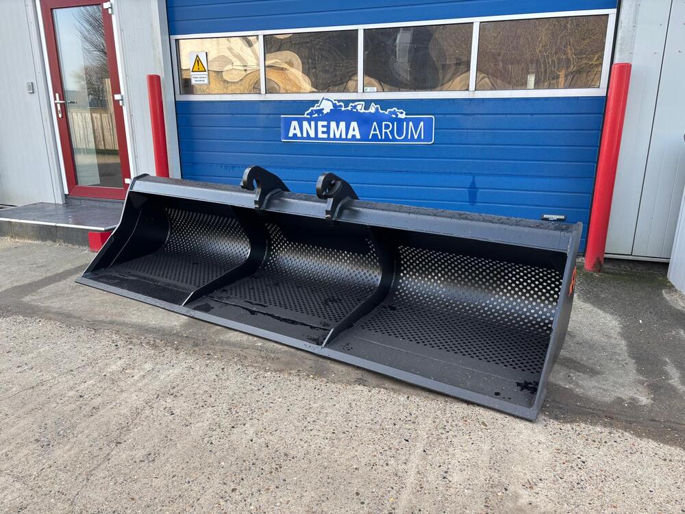 Voor baggerwerk, uitvoering met geperforeerde achterkant, inhoud 1750ltr. 1:1 / 1050ltr. (water), breedte 350cm, ophanging CW30, gewicht ±830kg., machineklasse 18-26ton. Ook te huur.