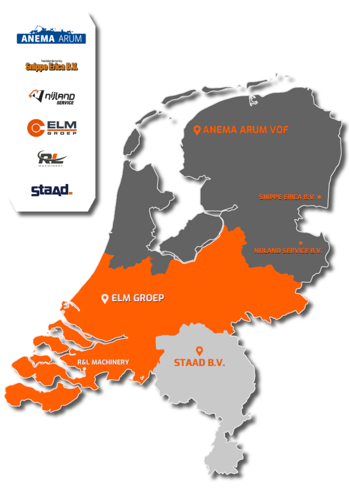 Gevestigd in Arum blijft Anema verantwoordelijk voor de regio’s Groningen, Friesland, Drenthe, Noord-Holland, Flevoland en Overijssel. De ELM Groep, gevestigd in Waddinxveen, zal de regio’s Gelderland, Utrecht, Zuid-Holland, Zeeland en West-Noord-Brabant (ten westen van de A27) bedienen. Staad, gevestigd in Veghel, zal verantwoordelijk zijn voor Limburg en Noord-Brabant, waarbij het werkgebied wordt begrensd door de oostzijde van de A27-snelweg.