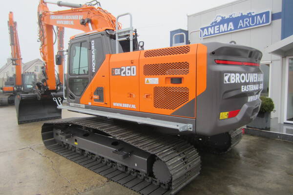 De DX260LC-9 weegt circa 26.000 kg en is uitgerust met een Develon DX05V 4-cilinder dieselmotor met commonrail, conform Stage V emissienormen. De machine biedt uitstekende hydraulische prestaties, waardoor zowel grote als fijne werkzaamheden nauwkeurig en efficiënt kunnen worden uitgevoerd.