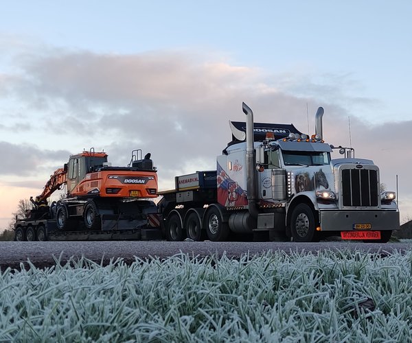 Doosan DX140W-7 op de boot voor Hoveniersbedrijf Duinhof Terschelling